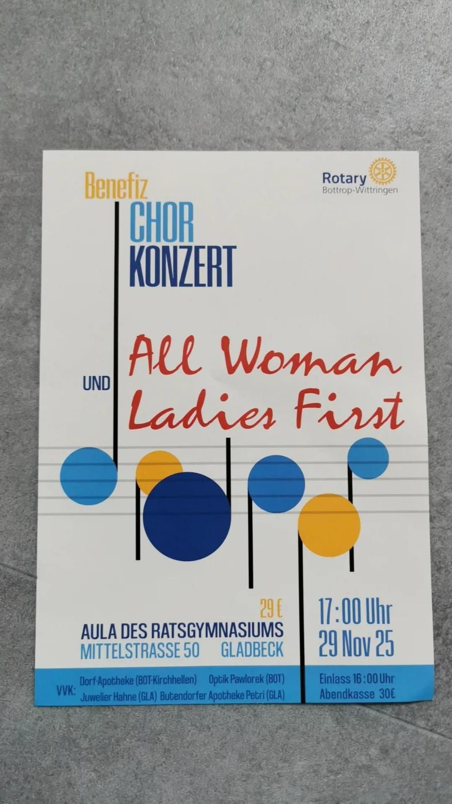 Der Rotary Club Bottrop Wittringen freut sich sehr, in Zusammenarbeit mit dem Ratsgymnasium und dem Heisenberg-Gymnasium ein Benefizkonzert veranstalten zu können. Mit den beiden Frauenchören „All Woman“ aus Bottrop und „Ladies First“ aus Dortmund konnten wir zwei erstklassige Chöre für unser Konzert gewinnen. Musikalisch dürfen sich die Besucherinnen und Besucher auf ein abwechslungsreiches Programm freuen.