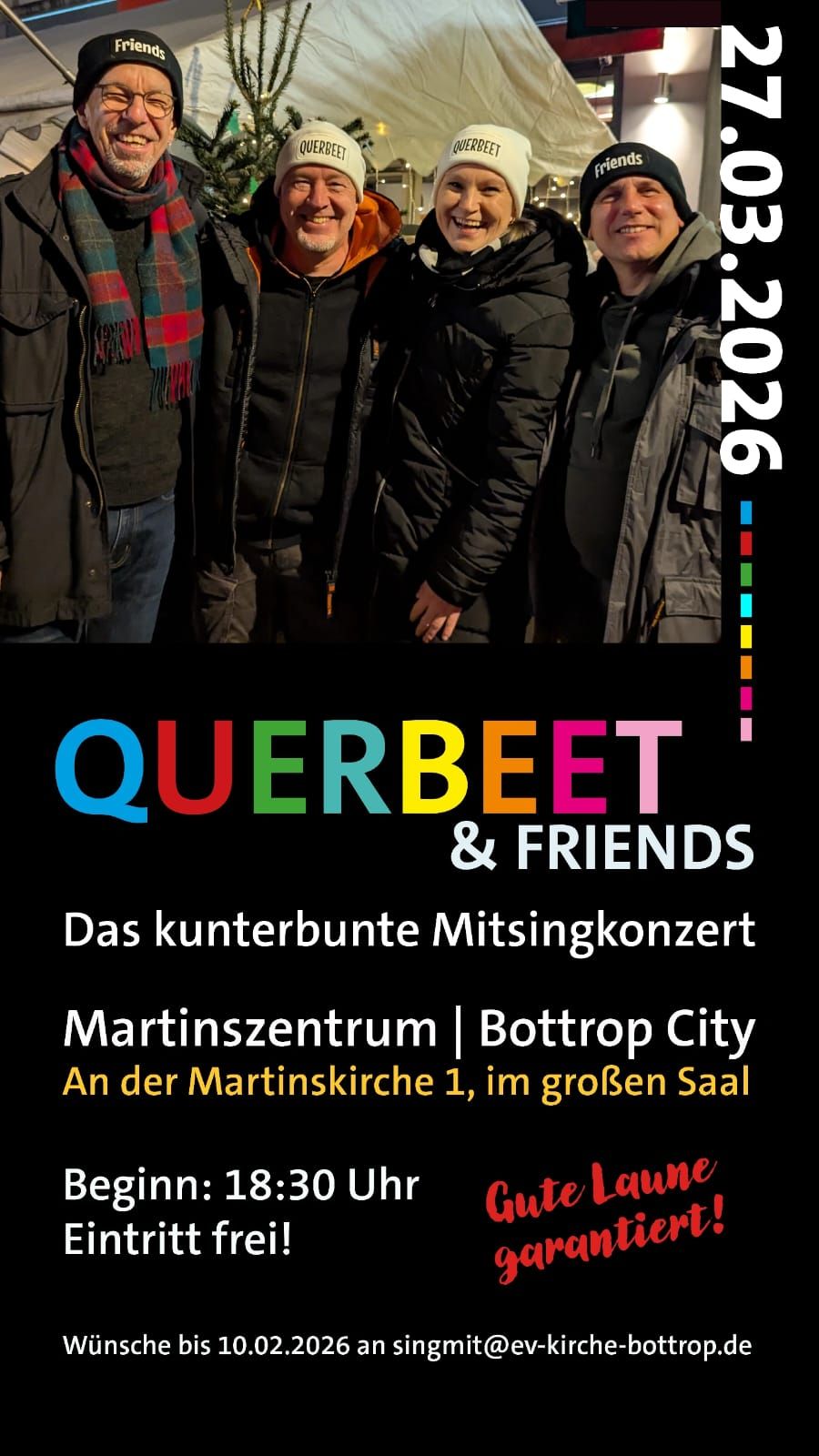 Anlässlich der internationalen Wochen gegen Rassismus in Bottrop gibt es am 27.03.2026 eine besondere Ausgabe im Saal des Martinszentrums. „Querbeet & Friends“, so heißt das Mitsingkonzert, das in wechselnder Besetzung nun schon seit mehr als 7 Jahren regelmäßig im Martinszentrum und an weiteren Locations in Bottrop stattfindet. Ein bunter Mix aus guter Live-Musik und smarter Moderation, der schnell für Stimmung sorgt und so ganze Säle zum Singen bringt. Auf der Bottroper Kneipennacht bespielte die Combo für Bottroper Bier schon einen Leerstand auf der Gladbacher Straße, im letzten Jahr das Café Kram – und auf der Grubennacht 2025 brachte sie die City „Open-Air“ zum Singen. Frontfrau Anja Hoppe, Drummer Sebastian Grzybek, Pianist Carsten Hein und Gitarrist Martin Pestke haben auch 2026 einiges vor und freuen sich auf viele schöne Konzerte. Oldies, Evergreens und Schlagerhits – aber auch bekannte Pop- und Rocksongs sind normalerweise im Repertoire. Anlässlich der internationalen Wochen gegen Rassismus in Bottrop gibt es am 27.03.2026 eine besondere Ausgabe im Saal des Martinszentrums. Mit bekannten Songs passend zum Thema – gemischt mit beliebten Pop- und Rock-Klängen, genau so, wie man es von diesem Format gewohnt ist. Herzliche Einladung ins Martinszentrum, An der Martinskirche 1 Für Getränke und Snacks ist gesorgt. Beginn: 18.30 Uhr Eintritt frei!