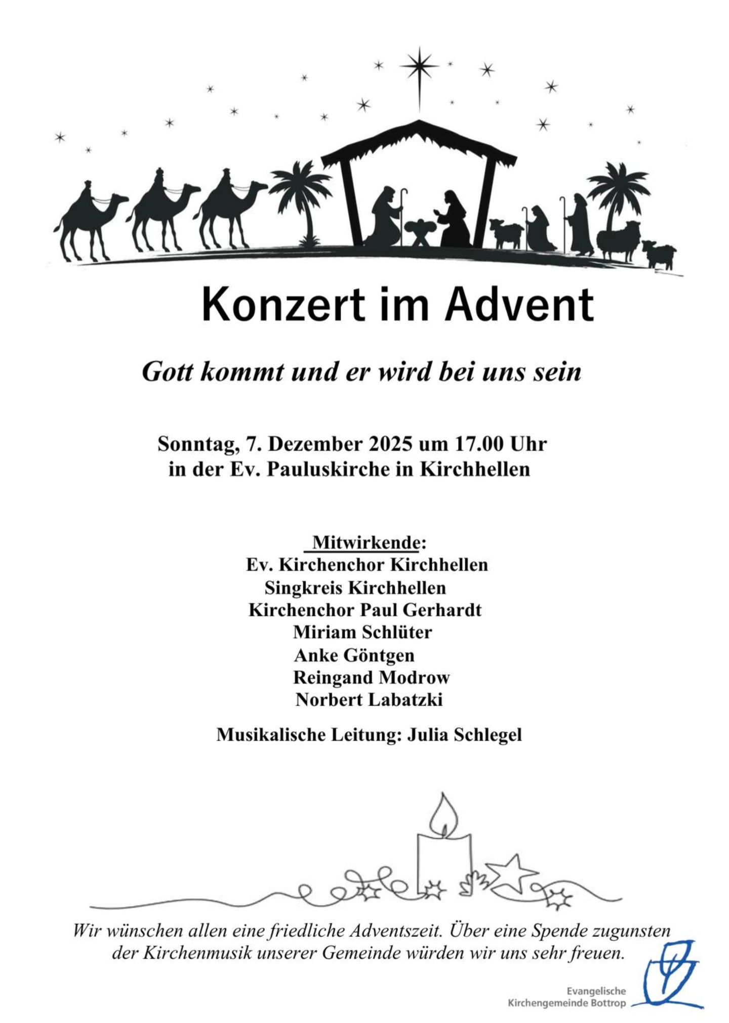 Das große Chorprojekt für alle, die Weihnachten ganz besonders einläuten möchten im nächsten Jahr. Auch für Anfänger geeignet. Je mehr mitmachen, desto wundervoller wird dieses großartige Erlebnis. Die Proben erfolgen im Kulturamt z.T. in geteilten Gruppen, so dass zwei Probenorte vorgesehen sind: Kammerkonzertsaal August Everding Kulturzentrum und voraussichtlich die Aula der Cyriakusschule sowie eine Probe im Gemeindesaal der Martinskirche. Endproben und Aufführungen finden voraussichtlich im Lichthof des Berufskollegs statt. PROBENTERMINE SAMSTAG 10.00 - 13.30 UHR: 31.01.2026 28.02.2026 25.04.2026 30.05.2026 27.06.2026 29.08.2026 19.09.2026 07.11.2026 21.11.2026 ENDPROBEN UND AUFFÜHRUNG: 27.11.2026 erste Probe mit Dirigentin 28.11.2026 Generalprobe 29.11.2026 18.00 Uhr Aufführung Konzertpartner wird das Folkwang Kammerorchester sein. Die Einstudierung übernehmen Ludger Köller und Elisabeth Otzisk, die bereits Erfahrung mit Projektchor-Arbeit in Bottrop haben (u.a. Aida, Der fliegende Holländer, Carmina Burana, Die Schöpfung). Anmeldungen sind erforderlich bis zum 18. Dezember 2025 bei Corina Krone unter E-Mail: projektchorbottrop@herr-der-mails.de Weitere Infos zu Probenort, Noten, Übungsmaterial etc. gibt es dann per E-Mail.