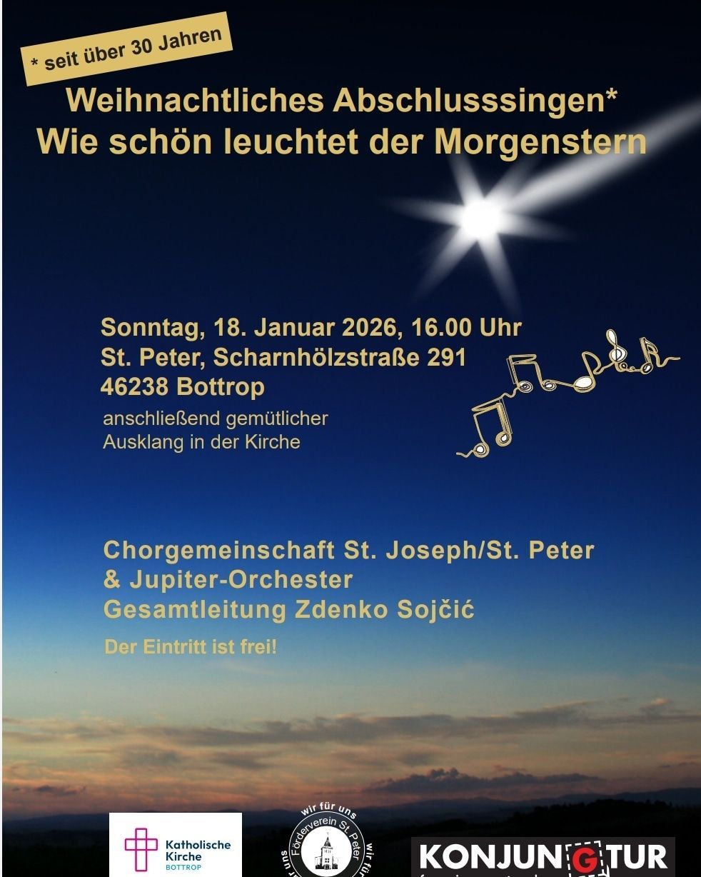 das Kammerensemble Euphonia hat einen jungen Teil an Sänger:innen, der sich in den letzten Jahren mit eigenständigen Projekten/Konzerten/Messgestaltungen unter den Namen "Knitted Voices" selbständig gemacht hat. Diese jungen Menschen haben nun ein Weihnachtskonzert auf die Beine gestellt, welches sie im Dezember letzten Jahres bereits in Herten aufgeführt haben. Da viele der Chormitglieder aus Bottrop-Boy und der Pfarrei St. Joseph stammen, bringen sie dieses Konzert nun am 11.01.2026 um 17 Uhr in St. Johannes (Bottrop-Boy) zur Aufführung. Einlass ist um 16:30 Uhr. Näheres entnehmt bitte dem beigefügten Flyer.